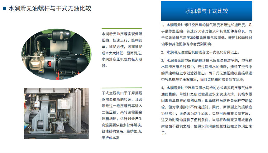由于純凈水參與了壓縮過程中的密封、冷卻和潤滑,極大地提高了效率,相同比功率產(chǎn)氣量比干式無油機(jī)增大20%以上,極大地降低了能耗。它的耗材只有便宜的水、空氣濾芯和水過濾芯,維護(hù)保養(yǎng)費用極低。